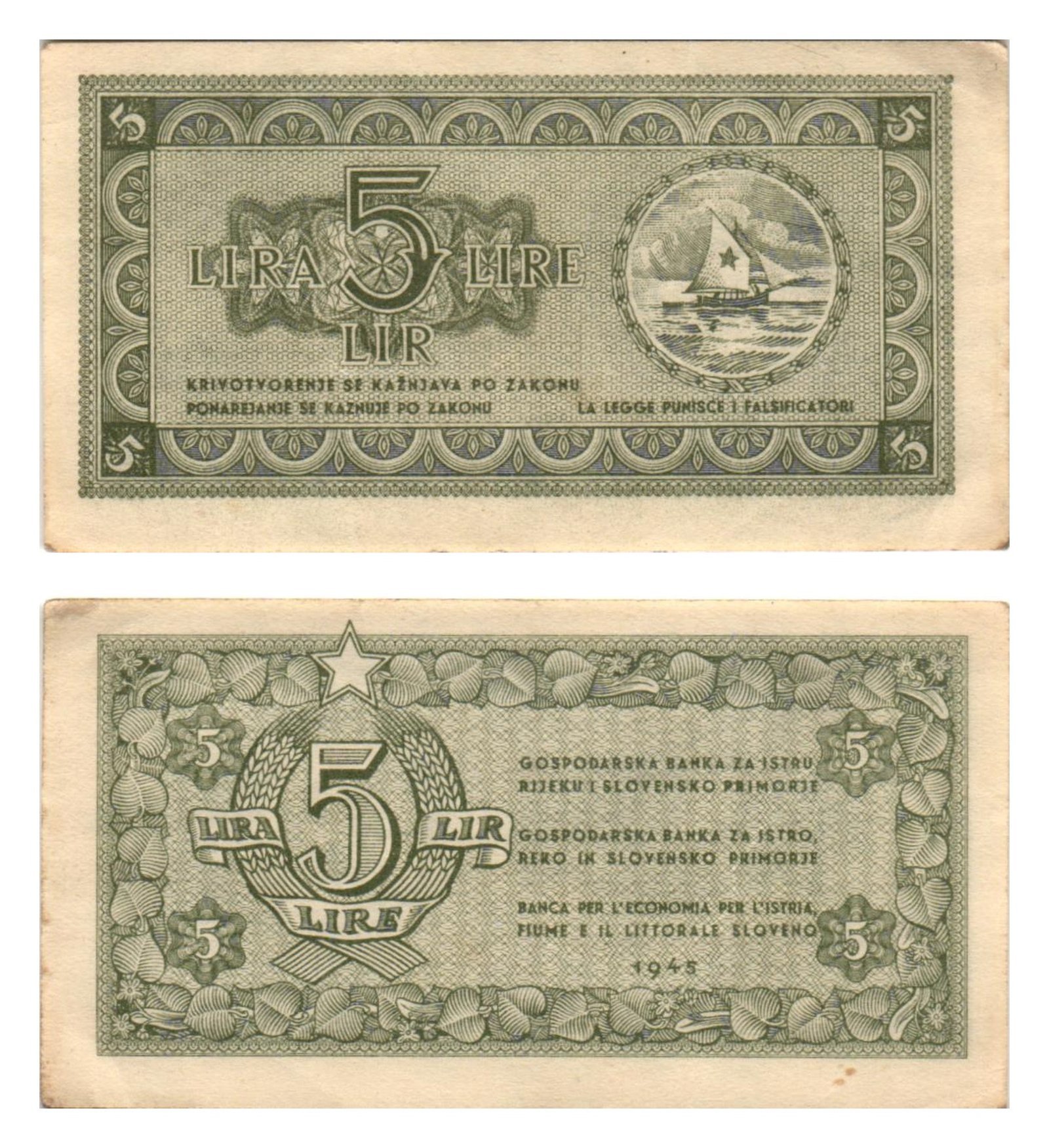 YUGOSLAVIA 5 lira 1945 / Economy Bank for Istra, Rijeka and Slovenian Littoral Region / VF+