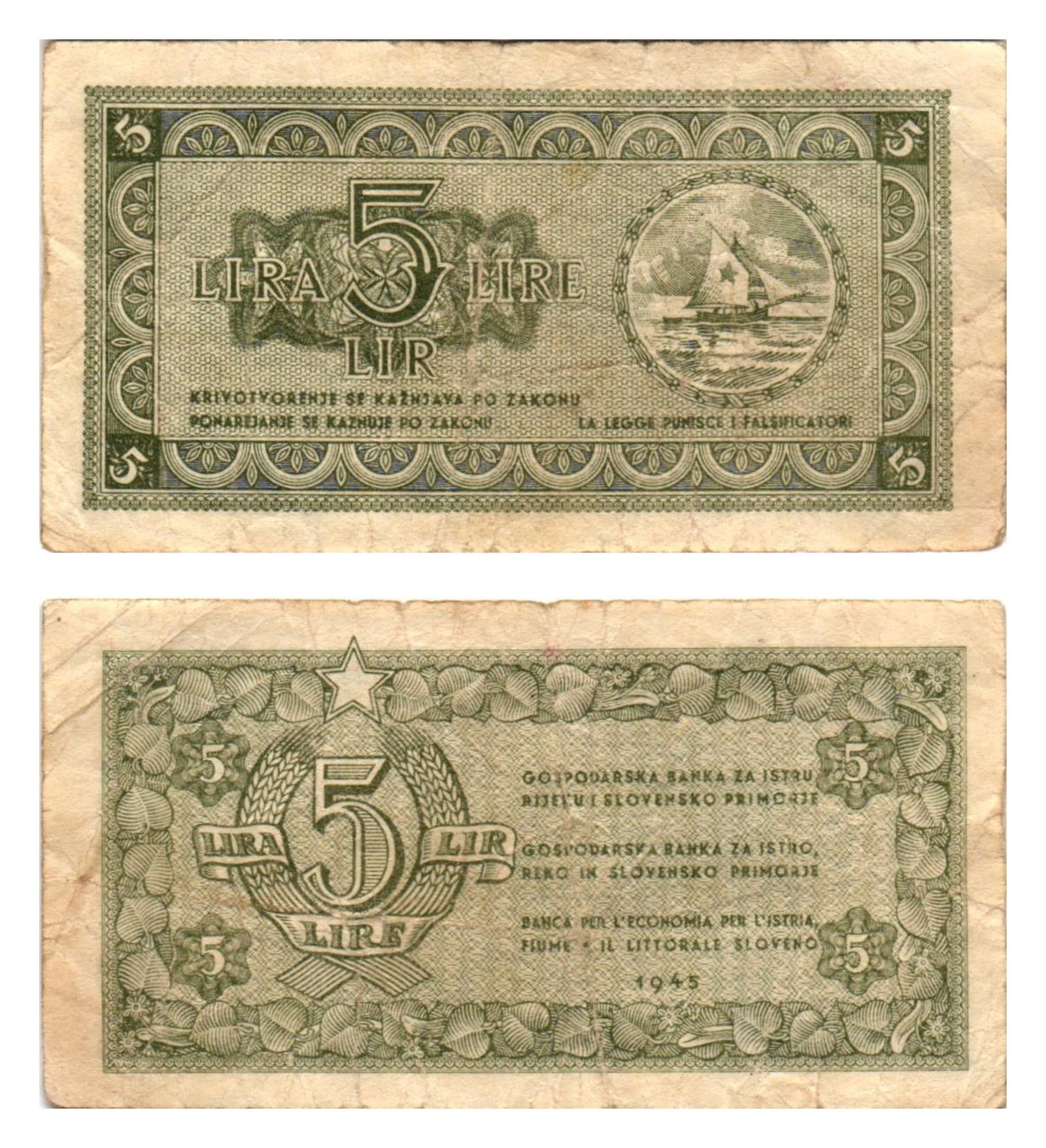 YUGOSLAVIA 5 lira 1945 / Economy Bank for Istra, Rijeka and Slovenian Littoral Region / VF