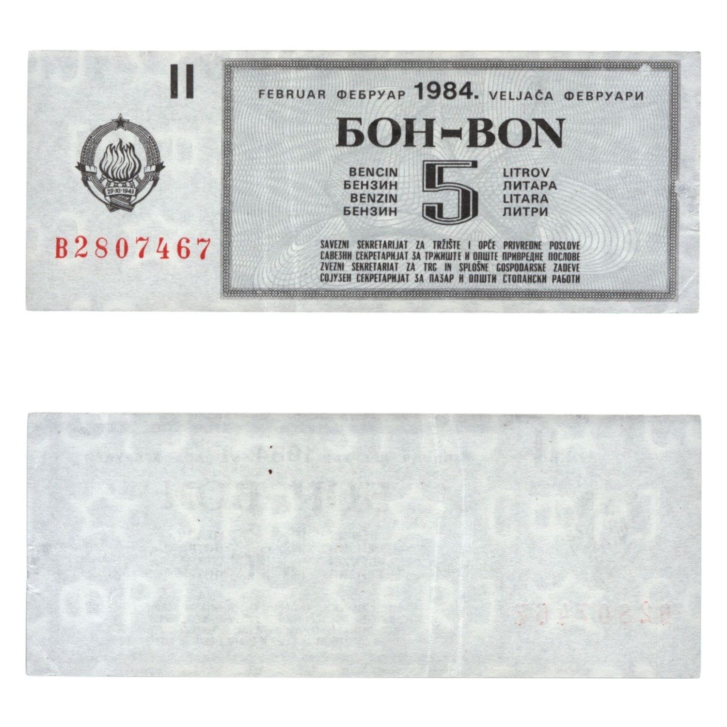 YUGOSLAVIA 5 liter of gasoline 1984 / February / Fuel Voucher / VF-