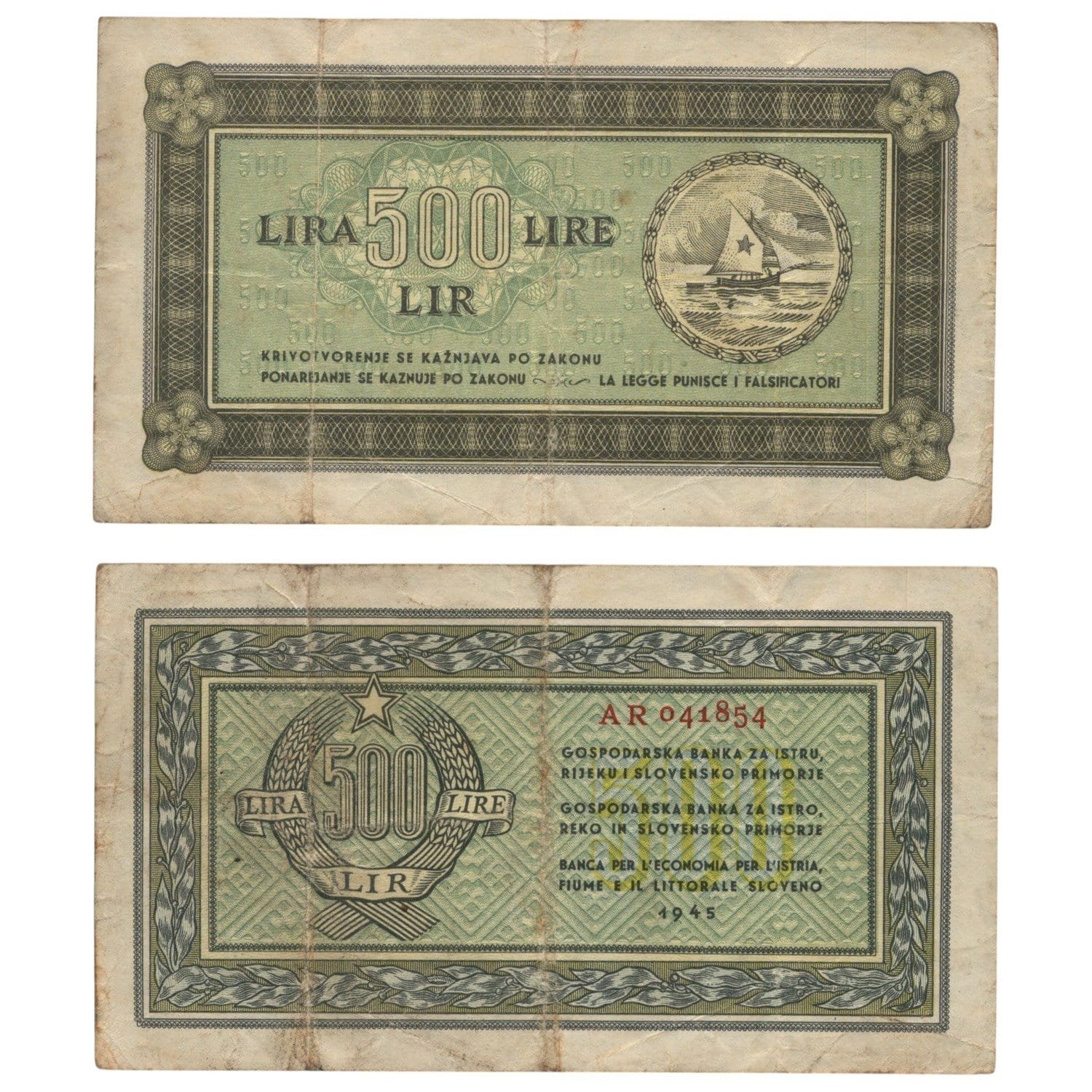 YUGOSLAVIA 500 lira 1945 / Economy Bank for Istra, Rijeka and Slovenian Littoral Region / VF-