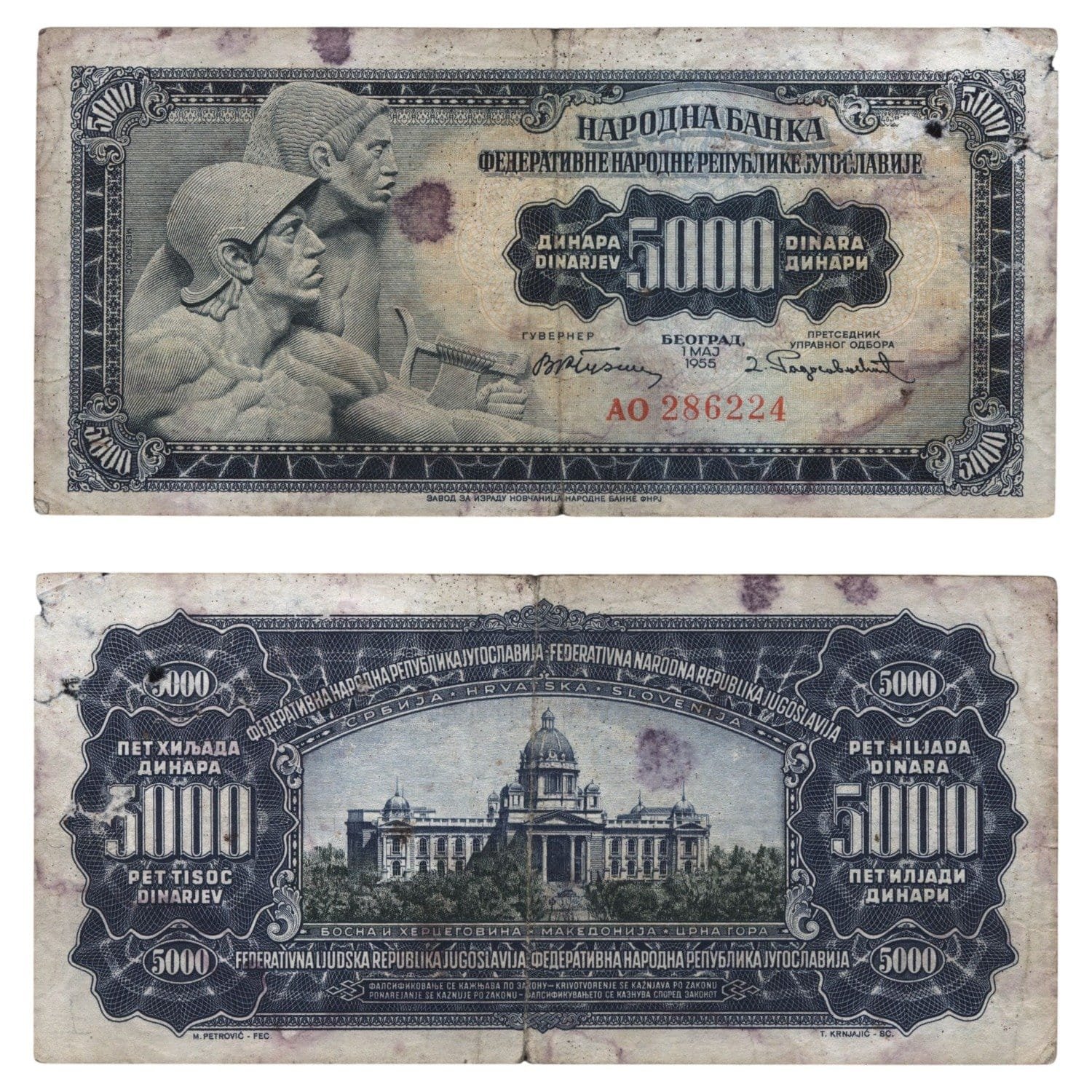 YUGOSLAVIA 5000 dinara 1955 / Without number 2 in lower right corner / VG