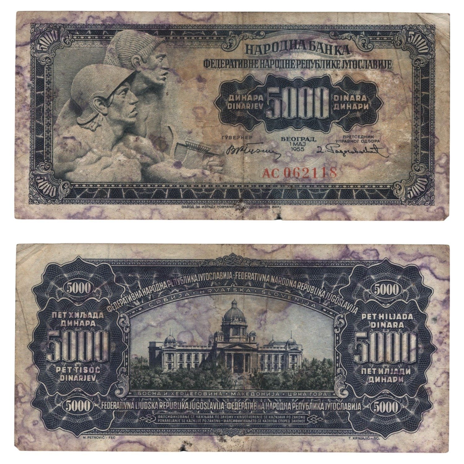 YUGOSLAVIA 5000 dinara 1955 / Without number 2 in lower right corner / VG