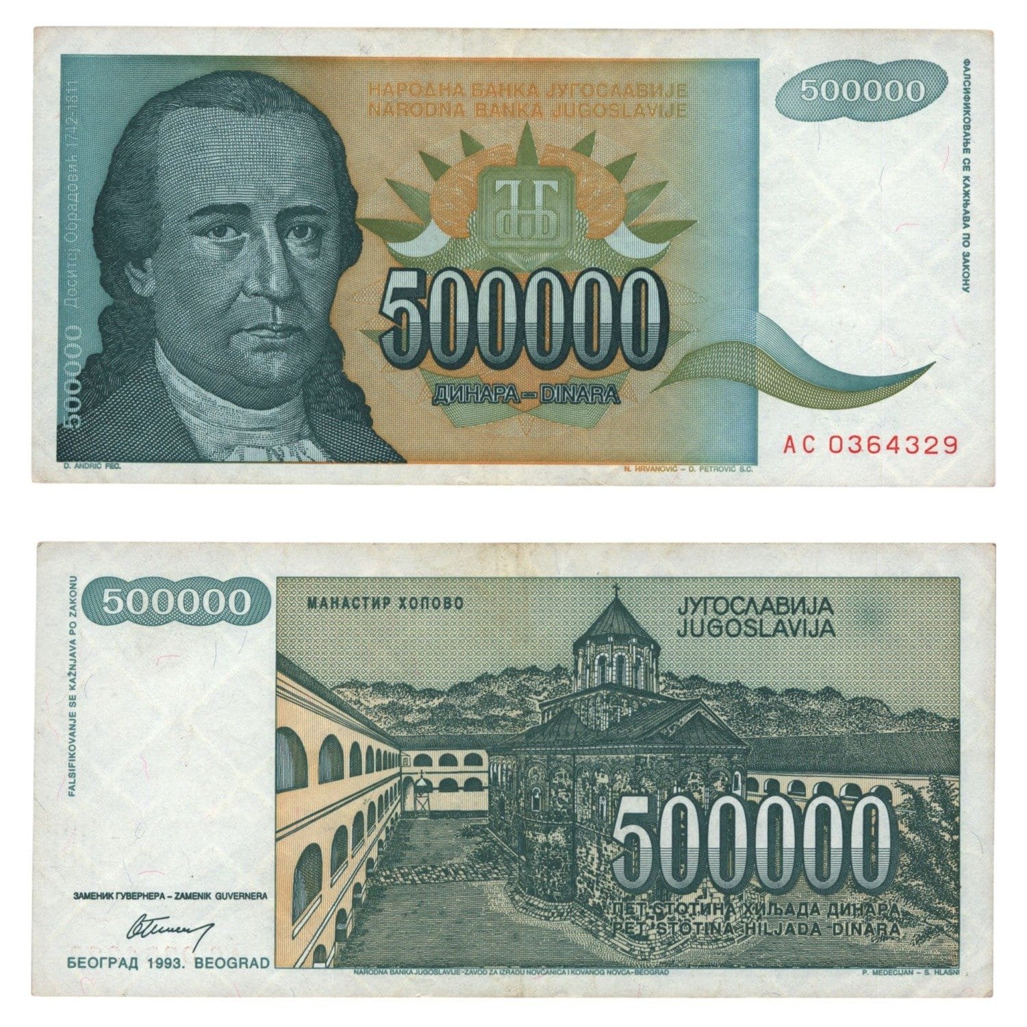 YUGOSLAVIA 500000 dinara 1993 / Error: extra paint near the inscription JUGOSLAVIA on reverse, so called “The Sun” / VF+