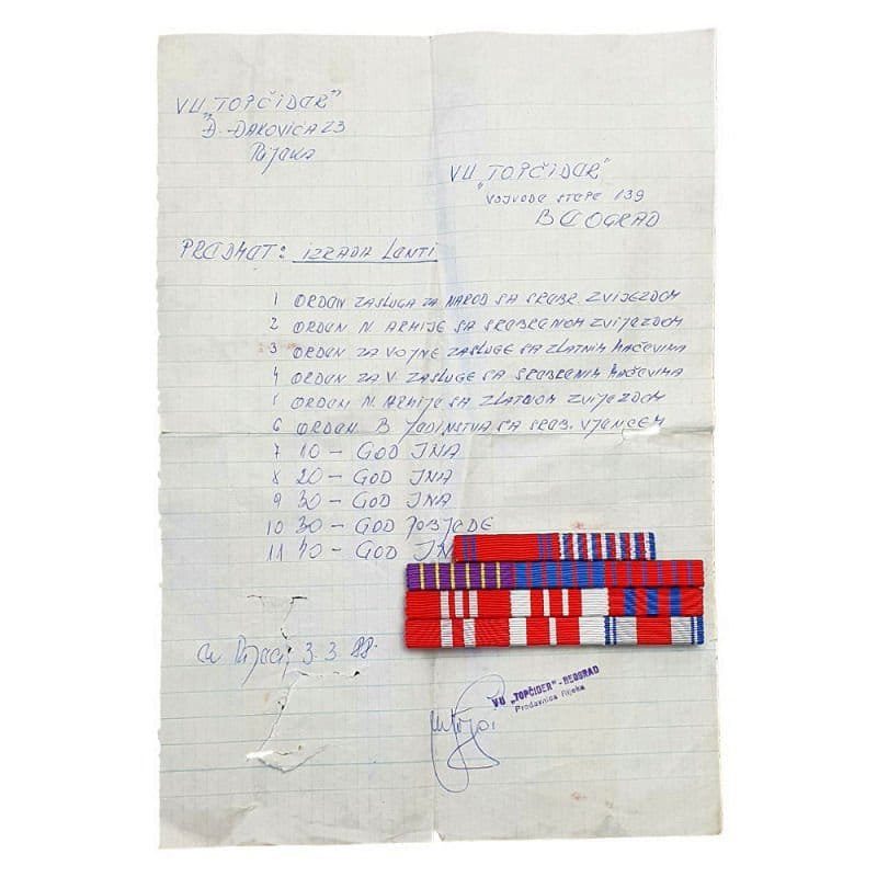 YUGOSLAVIA Orders and medals ribbons lot, 11 pcs., with original request for manufacturing signed by bearer